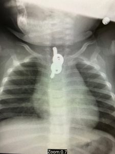 ההפתעה שציפתה להורים הייתה גדולה מאוד. בצילום נראו זוג מפתחות בוושט בגובה החזה. התינוק הובהל מידית למרכז הרפואי שערי צדק ושם כאמור הוצאו המפתחות ללא נזק.